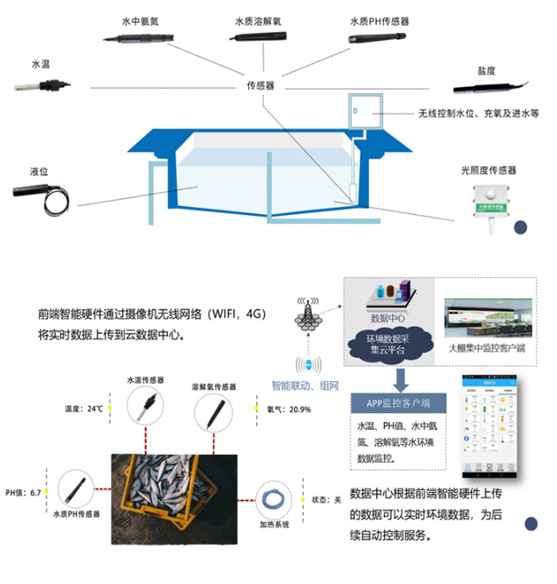 1、信息采集系统:温度传感器、光照强度传感器,水体溶解氧、PH值、氨氮含量、亚硝酸盐含量、水温探头等。用于监测水域影响鱼类生长的各类信息参数,及时消除不利因数。
