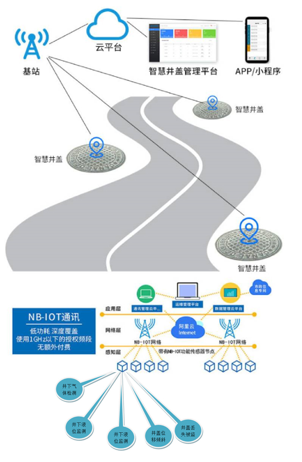 井盖数量多,分布广,且权属多家单位,靠人工巡查处置管理难度大。基于NB-IoT物联网的井盖监控器及报警系统为解决井盖管理问题带来了契机。NB-IoT有容量大、功耗低、覆盖远的特点,在井下恶劣的条件下信号也能快速传输出去。井盖监控器及报警系统主要功能包括井盖位置地图管理、井盖资产管理、井盖告警实时监控、井盖故障派单处理等。实时监控井盖状态,基于轨迹分析和倾角检测的井盖监控器,当井盖发生翻转或移动后会第一时间通知报警中心;建立基于RFID的电子标签为井盖建立的身份标识,对井盖统一归档、统一管理;基于物联网的智能井盖监控平台可以对城市中各个部门的井盖进行统一管理,提高管控效率;通过手机APP也可以实现井盖状态监控。