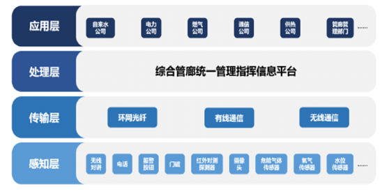 综合管廊内部管线属性复杂、重要节点数量多、投资、建设、运营主体不同给后续的管理带来了很大个麻烦。通过建立管线资产管理系统,实现对综合管廊入廊管线的数量、种类、权属单位、建设单位、管理单位信息管理。明确各方职责,提高经济管理效率。通过绑定在管线上的综合监控系统电子标签,实现关键节点路由信息和属性信息(管径、管材、用途、传输介绍种类、压力、流向、铺设时间、施工单位、权属单位)的全面掌握。在这些数据的基础上,实现对入廊管线的透明管理。整个智慧管廊的技术架构较为复杂,如下图: