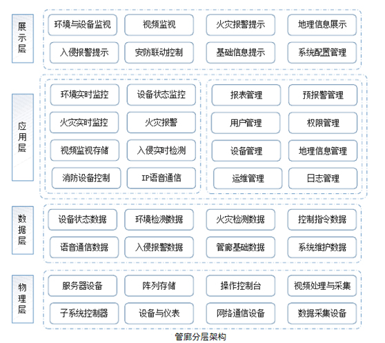 应用层:应用主流的架构实现互联网门户服务系统。由于政府管理部门和相关管线单位(给水、电力、燃气、通信、供热)的本专业管线运行信息会影响到管廊本体安全或其它专业管线安全运行,因此在应用层要对相关管线单位提供通信接口,以实现信息的共享和联动。