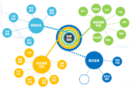 智慧管廊管廊是建于城市地下用于容纳两类及以上城市工程管线的构筑物及附属设施,是城市基础设施的一种类型,是一种高效集约的城市地下管线布置形式,用于服务人民生产生活的市政地下工程。包含给水、雨水、污水、再生水、天然气、热力、电力、通信、广播电视等,这些市政管线均因地制宜的纳入综合管廊。因此智慧管廊既要实现系统的安全、稳定运行,又要实现对供电、消防、照明、通风、排水等系统的“集中管理”。智慧管廊的实现大致由一下几个部分组成:
