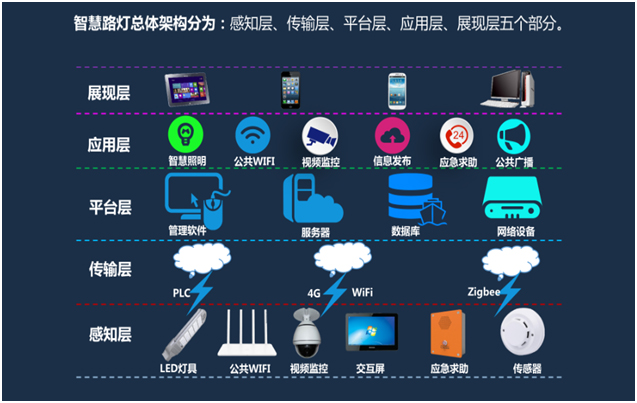我们通过城市传感器、电力线载波/ZIGBEE通信技术和无线GPRS/CDMA通信技术等,将城市中的路灯串联起来,形成物联网: